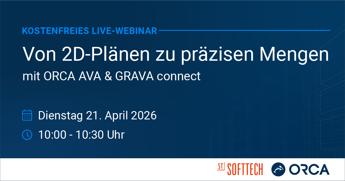 Die Mengenermittlung aus 2D-Plänen ist ein wichtiger Teil des Arbeitsablaufs in vielen Planungsbüros. Durch den Einsatz moderner Werkzeuge und optimierter Arbeitsmethoden kann dieser Prozess jedoch deutlich verbessert werden. Das kostenlose Live-Webinar von ORCA Software und Sofftech am 21. April 2026 bietet eine gute Gelegenheit, um mehr über die Möglichkeiten moderner Softwarelösungen zu erfahren und um den eigenen Workflow zu optimieren. Nutzen Sie diese Gelegenheit, um Ihre Mengenermittlung zu revolutionieren und Ihre Arbeitsergebnisse zu verbessern.